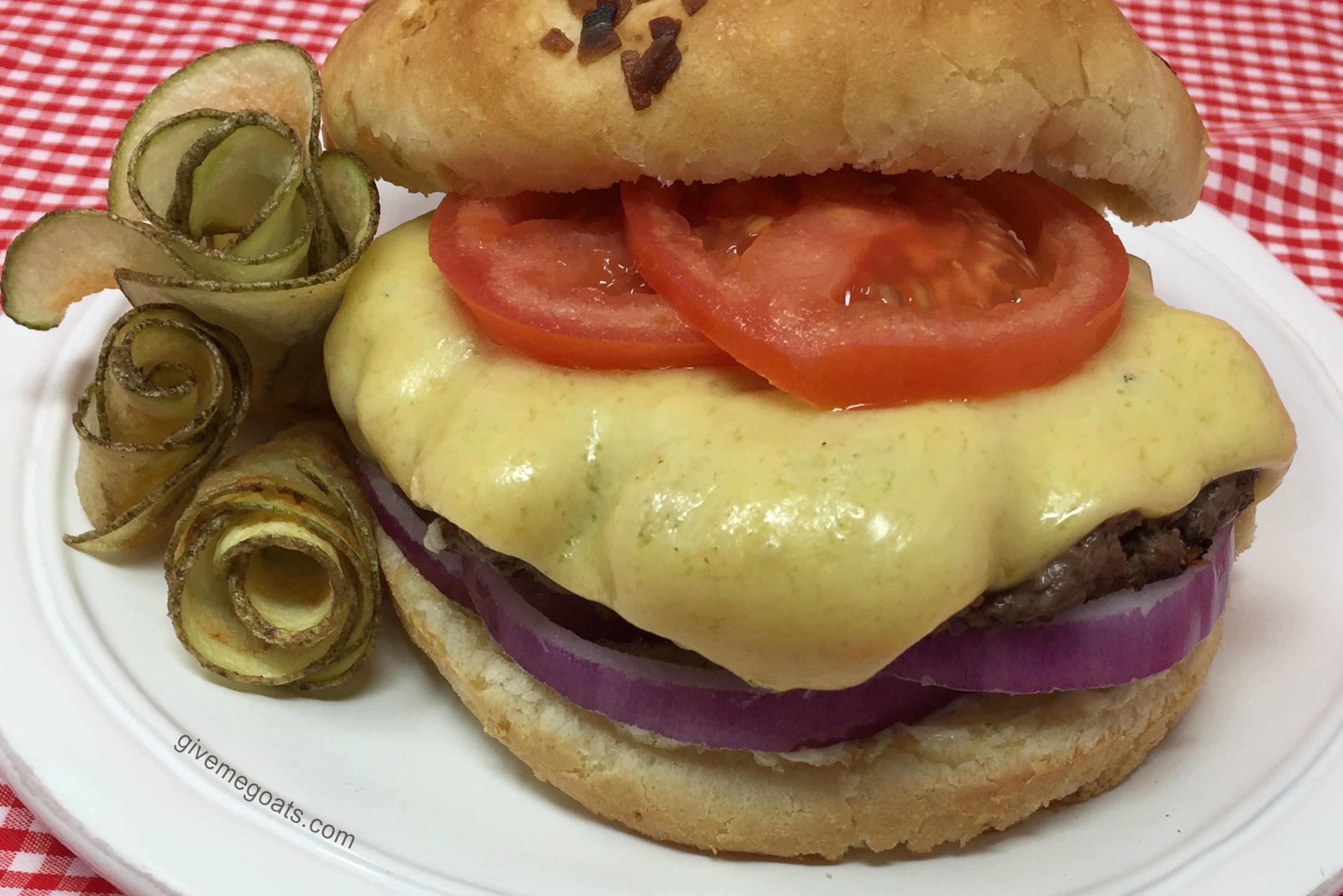 In a nutshell, you can make American-style cheese slices by grating your own semi-hard cheese and combining it with gelatin and a little evaporated milk. I make my own cheeses with our goat milk, and make my own evaporated milk from goat milk as well. That way, I don’t need to be concerned when my cow-milk-intolerant friends come over for dinner. (They can eat the same things we are eating and no one feels awkward.) The melted cheese mixture is then poured onto shallow cookie sheets lined with plastic wrap, and cut into slices which can be stacked up and stored in an airtight container in the fridge for up to thee weeks. The whole process takes less than half an hour if you’re using canned evaporated milk; a little longer if you’re making your own like I did. It’s a half hour well spent to give your burgers the kick that more flavorful cheeses have to offer.