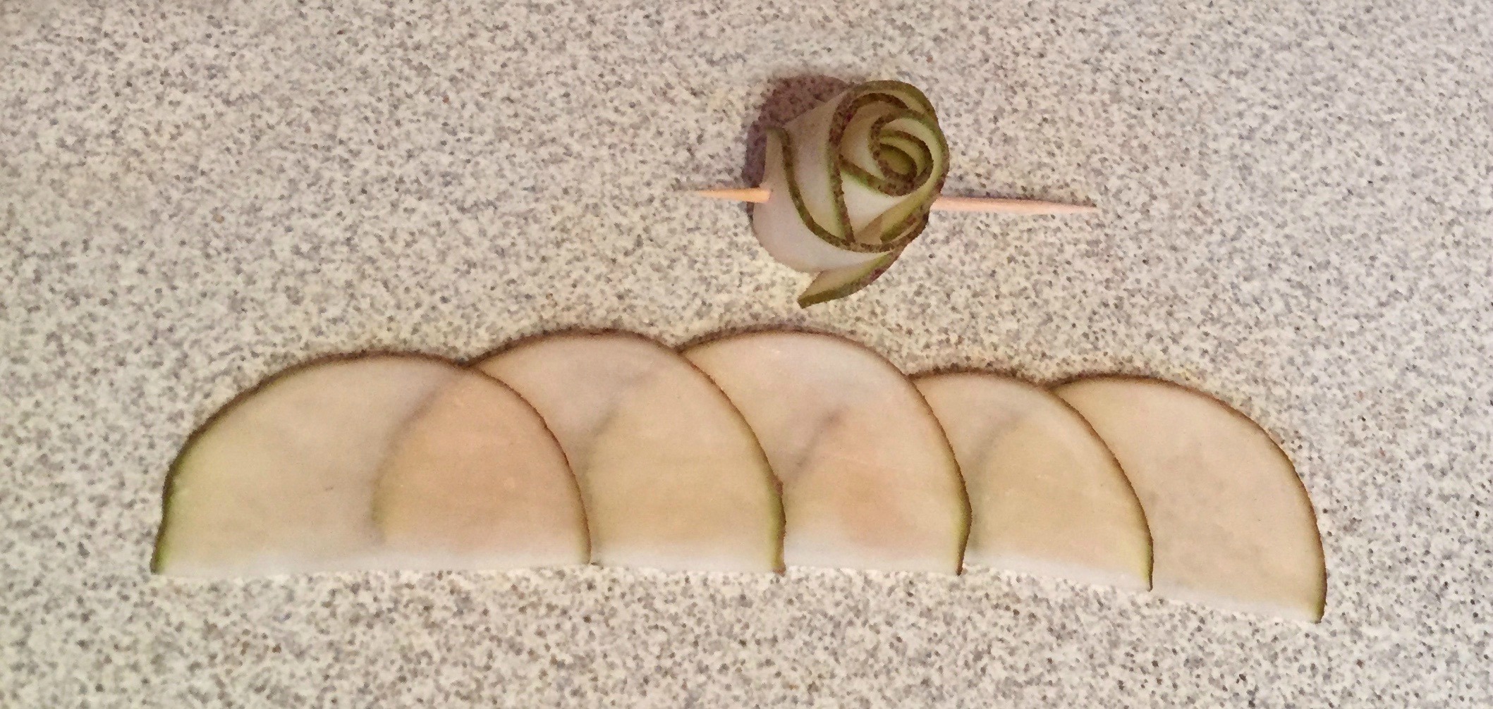 Oh, you noticed the potato chip roses? Do you like those? They’re easy to make while you’re making homemade potato chips anyway, because a burger this awesome obviously deserves homemade chips. Using your mandoline (or slicing very carefully with a knife), make 5 slices of potato, and cut them in half across the middle. Overlap the half slices as shown here, and roll them up as tightly as the potato will allow without cracking. Secure with a toothpick. Drop the potato roses into 300° oil and fry until golden. Remove from hot oil and drain on a rack above paper towels, removing the toothpick as quickly as possible. If you wait until the potato chip rose is cool before removing the toothpick, the rose will break.