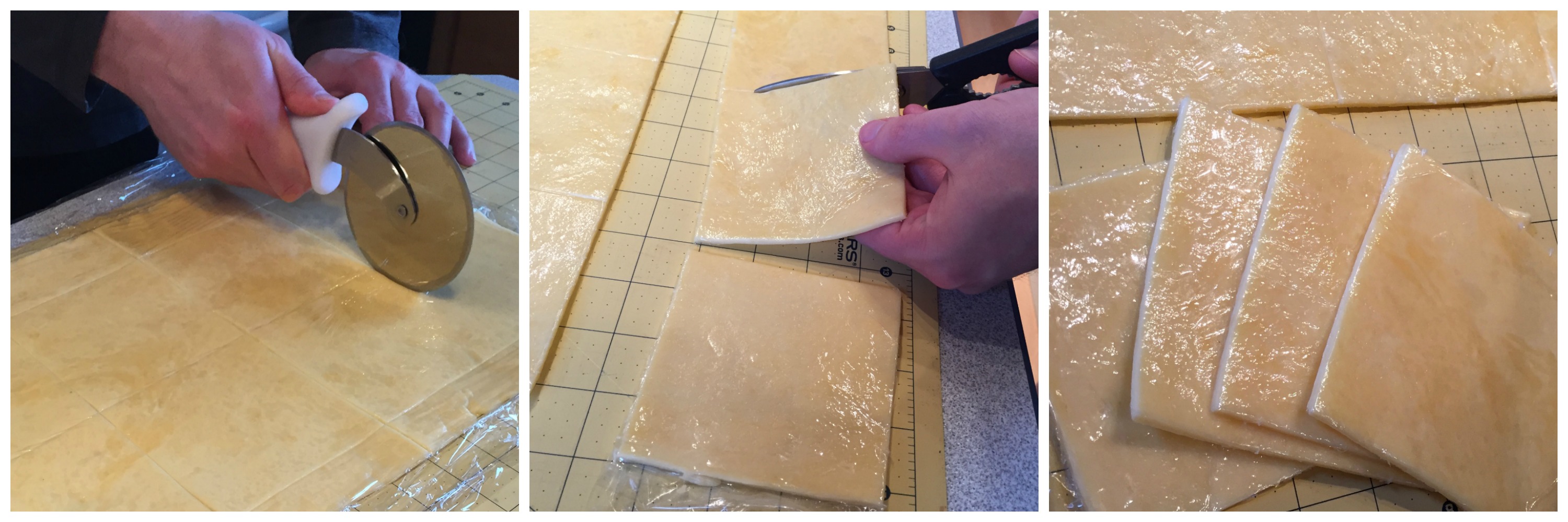 When it came time to cut the cheese slab into cheese slices, I deviated a bit from the instructions by adding a second sheet of plastic wrap on top of the slab, and used a pizza cutter to cut the slices. This did not cut the plastic wrap, though, so I followed up with kitchen shears to cut the plastic wrap apart. (Why didn’t I just use the scissors in the first place? Because I didn’t want the cheese gumming up my scissors and making the cuts untidy. That doesn’t mean you can’t just go straight for the scissors though, or leave off the top plastic wrap sheet and cut the slices with a knife.) In case you’re wondering, yes, I used an old clean quilting mat to make sure my slices were precisely 4″ squares. The plastic wrap kept the food off of the mat. You don’t have to be so picky about getting yours square if you don’t want to.