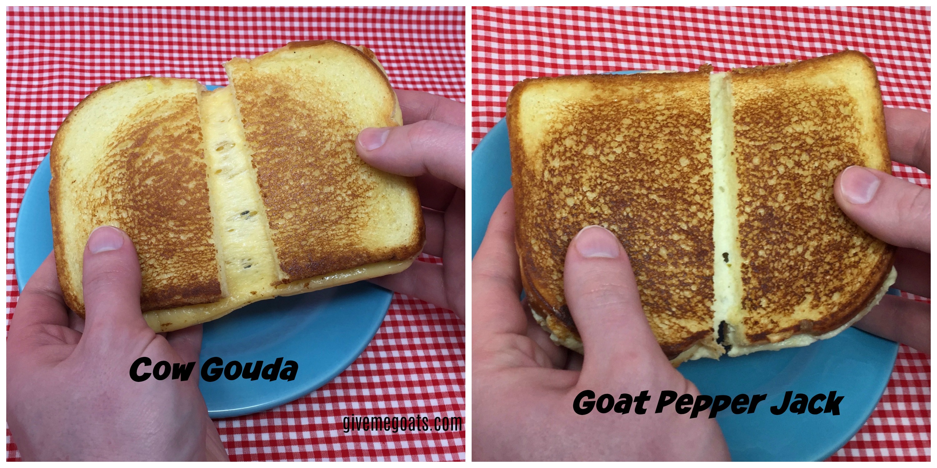 I experimented with two kinds of cheese slices today. One was made with store-bought cow-milk gouda. Keeping in mind that cow- and goat-milk cheeses have different melting properties, I wanted a “control” recipe to compare my homemade cheese recipe against. Plus I love me some gouda and didn’t have any on hand. For my own cheese, I used a 9-month-old hot pepper jack that I made last summer.