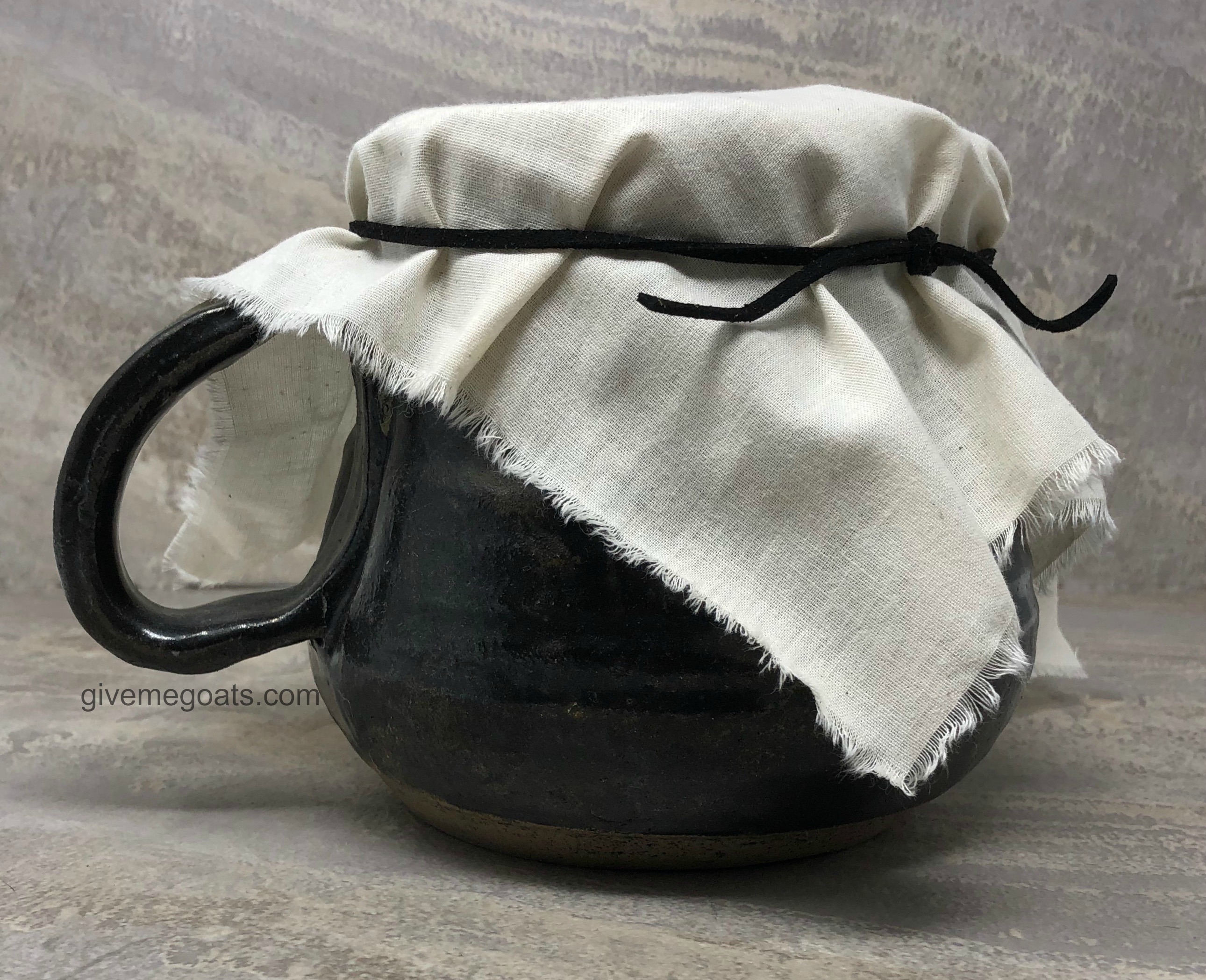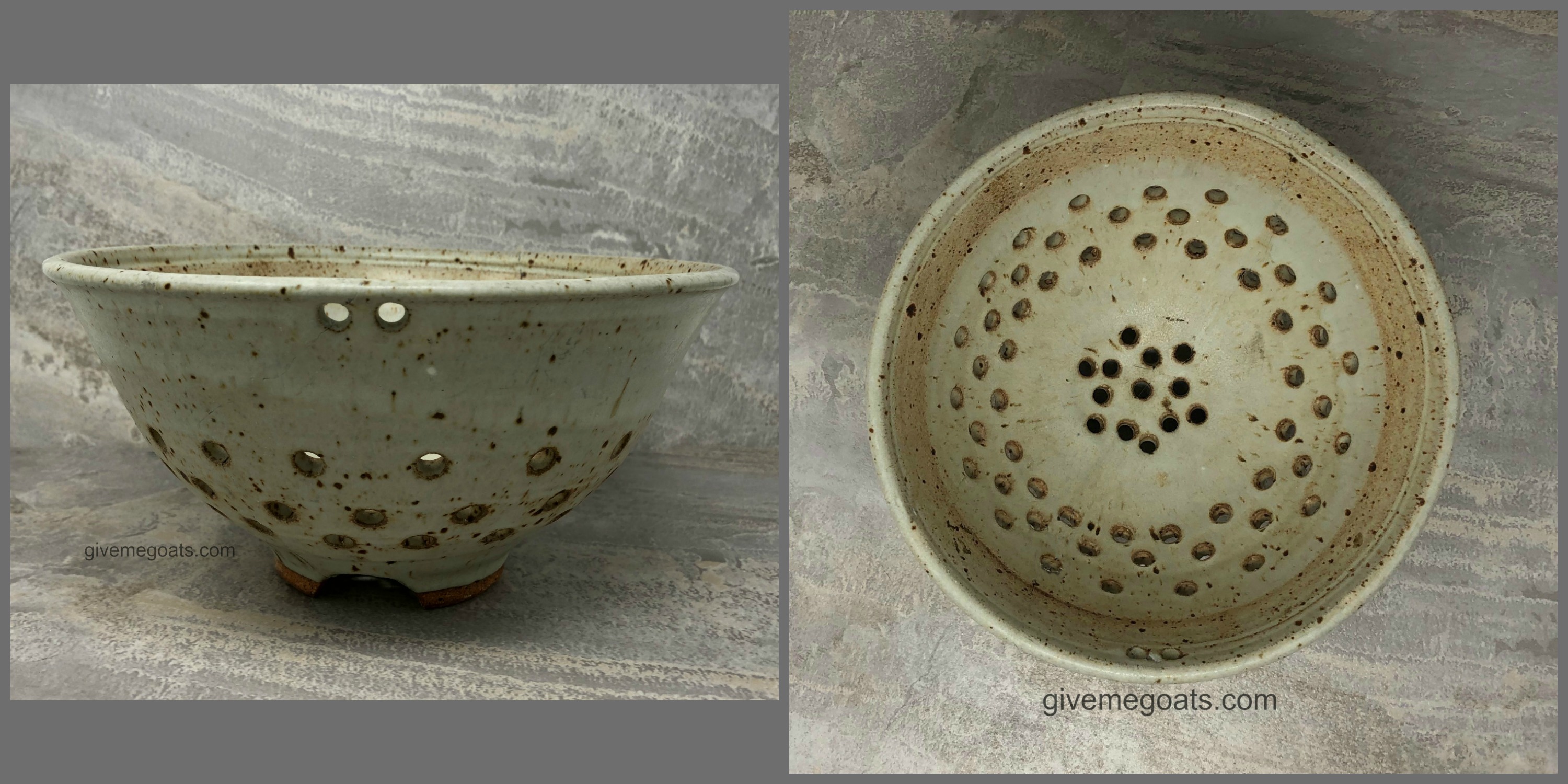 I have a small collection of pottery pieces that includes this strainer. I like to think mine is similar to the ones those Neolithic housewives would have used. Mine has little feet to elevate it out of draining liquids, and two holes near the rim for a leather string to hang it by, although I removed the leather string and don’t hang mine up. If you are using pottery for any type of food preparation, always be sure that only food-safe materials and glazes were used to make it!
