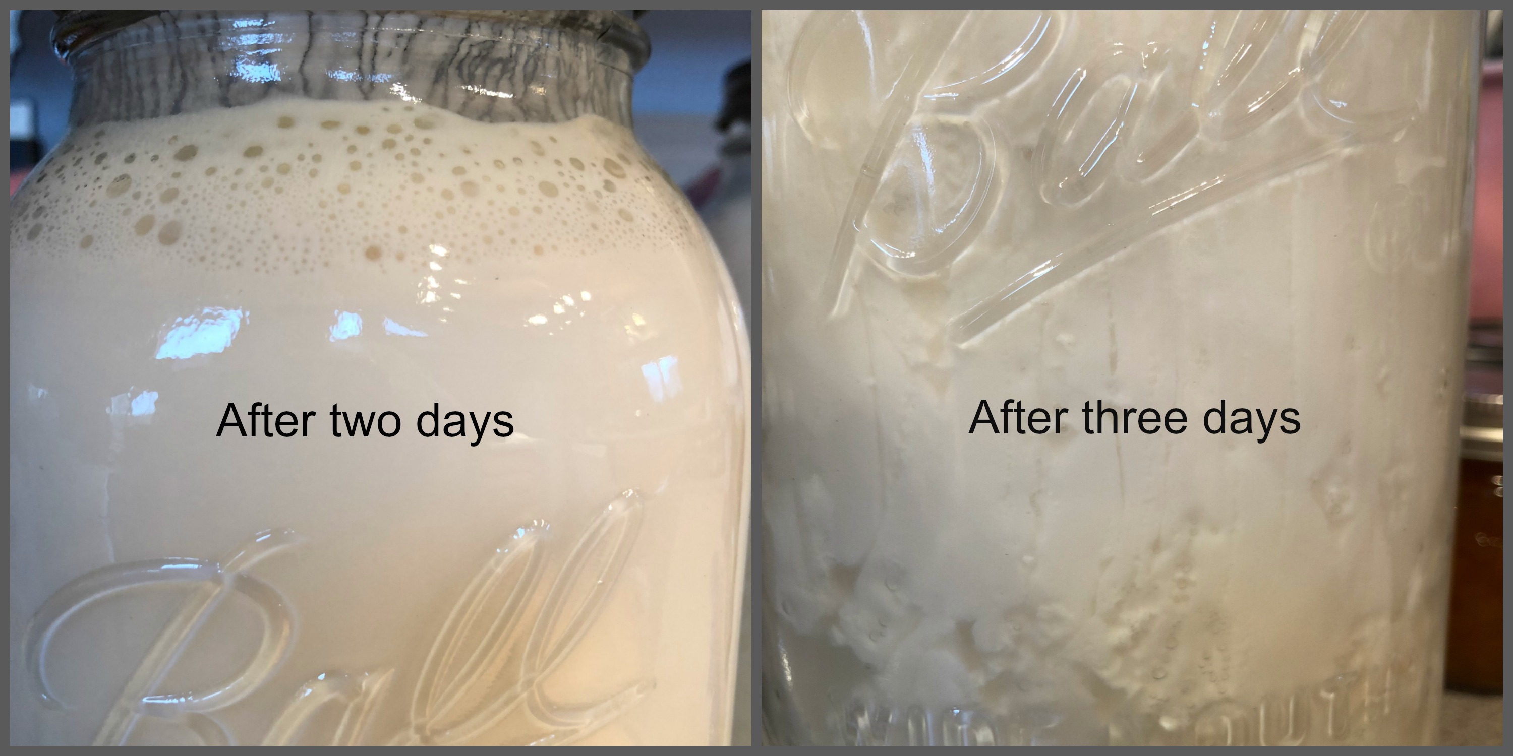 You can start with any amount of milk you’d like, expecting to get about a pound of cheese per gallon of milk. Set your jar of milk on the countertop, covered with a loose-fitting lid or a piece of cloth tied around the top. Make sure it’s not sitting in direct sunlight or too near a heat source like a stove or dishwasher. Leave the milk alone for two to three days until the milk clabbers and there is separation of curds and whey. You can see here that the milk on the left, which has been on the counter for two days, has begun to ferment and is a little bubbly. The milk on the right has been on the counter for three days, and has separated into curds and whey. Your milk may take a few hours longer or a few hours less, depending on the environment in your kitchen.