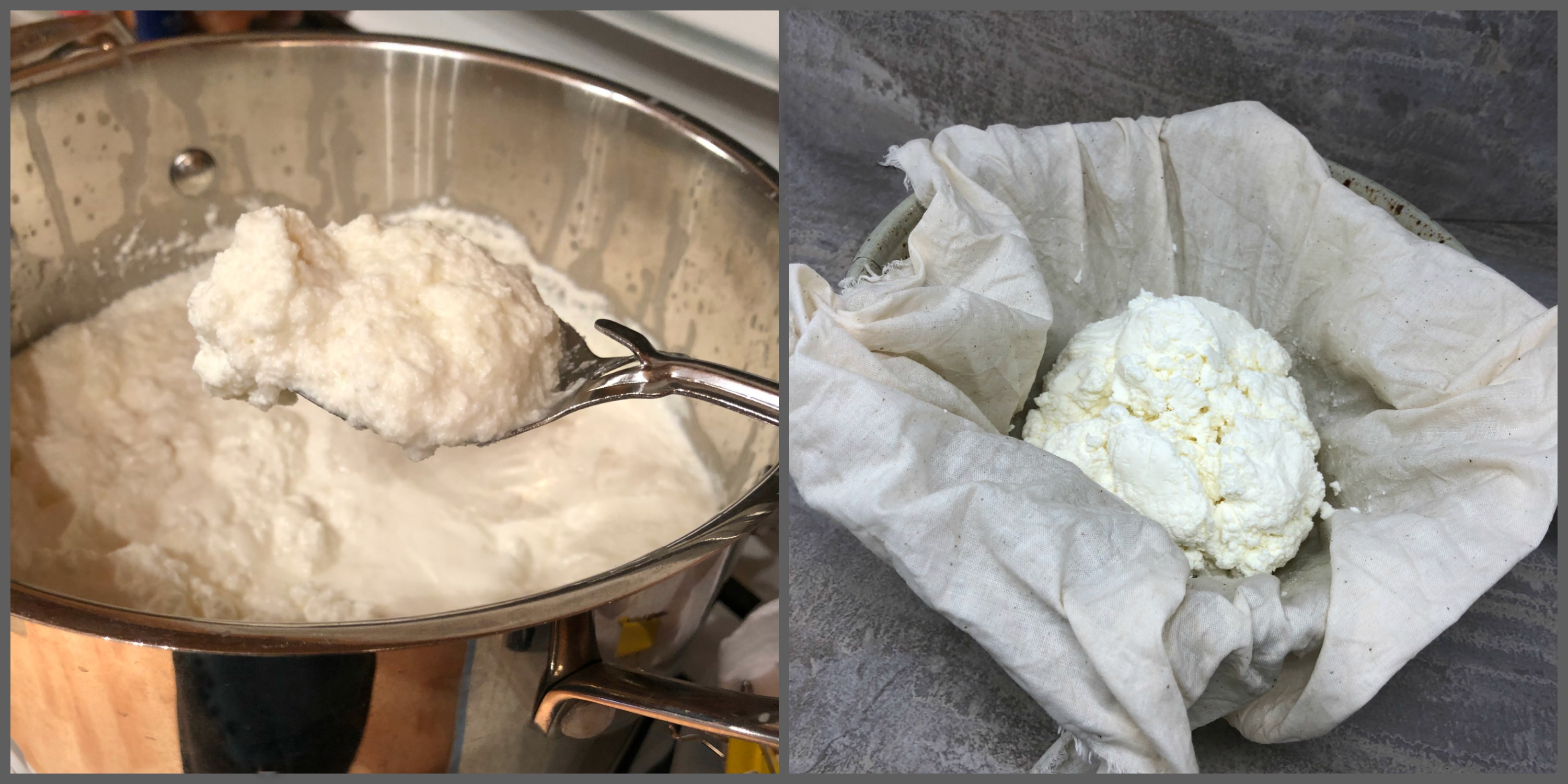 On the left, you can see the spoonful of warm curds, and on the right, the finished cheese.